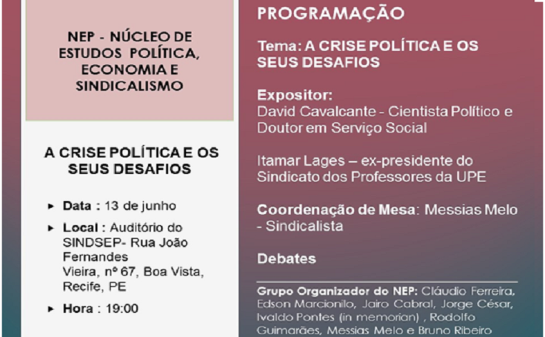 O Sindsep-PE sedia, na próxima terça-feira, mais um debate do Núcleo de Estudos Política, Economia e Sindicalismo (NEP). Dessa vez o tema em discussão é A crise política e os seus desafios. Para falar sobre o assunto estarão presentes o cientista político e doutor em Serviço Social, David Cavalcante, e o ex-presidente do Sindicato dos Professores da UPE e mestre em Saúde coletiva, Itamar Lages. A mesa será coordenada pelo sindicalista Messias Melo. O evento será aberto ao público e começa às 19h. Não perca!