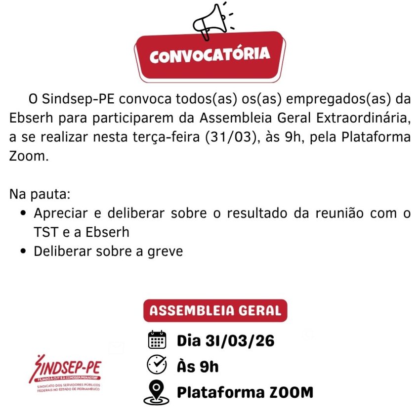 O Sindsep-PE convoca todas as trabalhadoras e trabalhadores da Empresa Brasileira de Serviços Hospitalares (Ebserh) para participarem da Assembleia Geral Extraordinária a se realizar nesta terça-feira (31/03), às 9h, pela Plataforma Zoom.