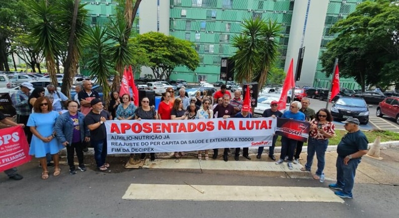Em ato na manhã dessa quinta-feira (27), em frente ao bloco C, na Esplanada dos Ministérios, aposentados e pensionistas da base do Sindsep-DF cobraram do Ministério da Gestão e da Inovação em Serviços Públicos (MGI) a instituição do auxílio-nutrição.