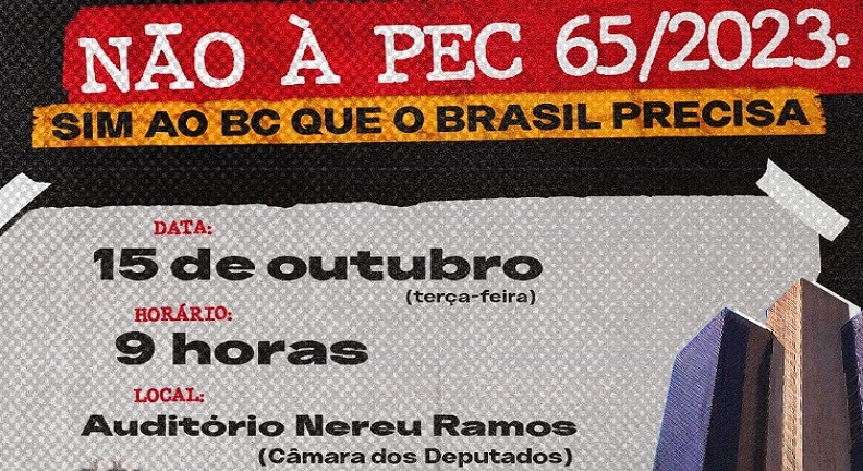 É para debater a possibilidade de privatização do BC, por meio da Proposta de Emenda Constitucional 65/2023, que será realizado o seminário "Não à PEC 65. Sim ao BC que o Brasil precisa", nesta terça-feira, 15, a partir das 9h, no Auditório Nereu Ramos no Anexo II da Câmara dos Deputados.