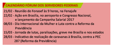 Como proposta, foi aprovada a criação de comitês nos estados e municípios contra as duas reformas e discutido um calendário de mobilização (ver no quadro acima), no sentido de pressionar o governo e o Congresso Nacional. Dentro da programação, está previsto o lançamento da campanha salarial 2017 dos servidores federais para o dia 22 de fevereiro. Na mesma data, haverá uma força tarefa no aeroporto de Brasília e nos gabinetes de deputados e senadores para debater as demandas do funcionalismo federal. Um dia antes, o Fórum Nacional dos Servidores Federais (Fonasef) se reúne para discutir outras estratégias de ação.