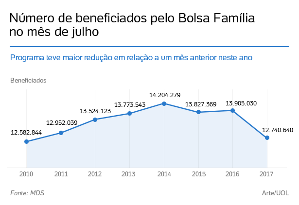 Ao todo, o programa pagou 12.740.640 famílias em julho. O número de bolsas pagas foi o menor desde julho de 2010, quando foram pagas 12.582.844 bolsas. Se compararmos julho de 2014 com o mesmo mês de 2017, houve uma redução de 1,5 milhão de bolsas pagas.
