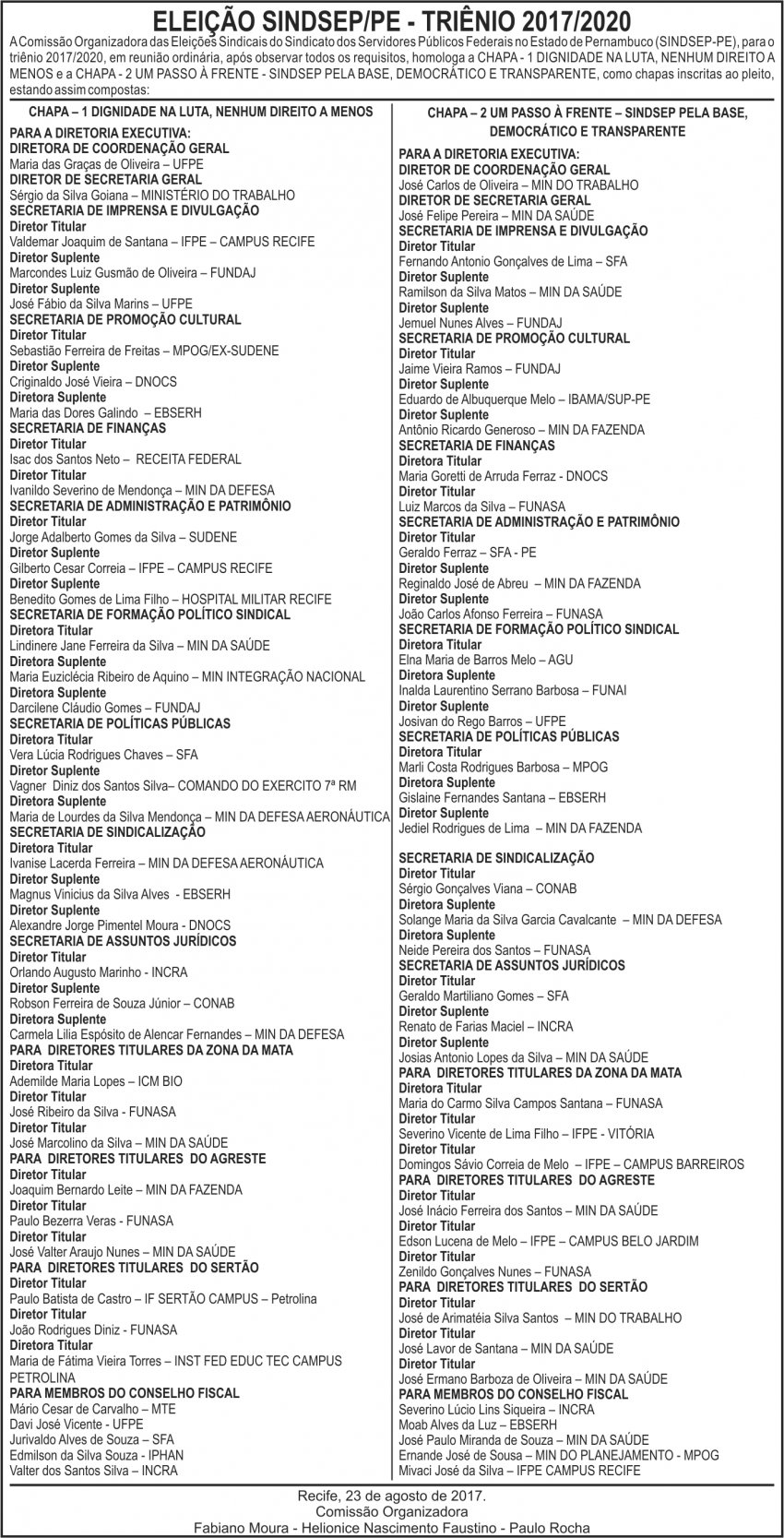 A Comissão Organizadora das Eleições Sindicais do Sindicato dos Servidores Públicos Federais no Estado de Pernambuco (SINDSEP-PE), para o triênio 2017/2020, em reunião ordinária, após observar todos os requisitos, homologa a CHAPA – 1 DIGNIDADE NA LUTA, NENHUM DIREITO A MENOS e a CHAPA – 2 UM PASSO À FRENTE – SINDSEP PELA BASE, DEMOCRÁTICO E TRANSPARENTE, como chapas inscritas ao pleito, estando assim compostas:
