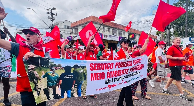 Com a faixa “Serviço público forte, meio ambiente protegido. Não à reforma administrativa!” e palavras de ordem contra a PEC 3Oitão (PEC 38/2025), os servidores denunciaram, na marcha, o Congresso inimigo do povo. Em vídeo gravado durante a manifestação, o diretor da Condsef/Fenadsef, Edison Cardoni, destacou que “o mesmo Congresso que permite o avanço da flexibilização das legislações ambiental e indigenista também quer aprovar a reforma administrativa que enfraquece os serviços públicos”.