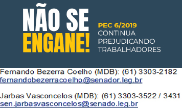 O relatório da PEC 06/2019, que trata da reforma da Previdência e praticamente acaba com a aposentadoria da classe trabalhadora, pode ser votado ainda em setembro no plenário do Senado. Junto com ela, a chamada PEC Paralela, um complemento à PEC 06, que, entre outros pontos, inclui nas mesmas regras da reforma os estados e os municípios. Para serem aprovadas, a reforma da Previdência e a PEC Paralela precisam do voto de 49 dos 81 senadores, um quórum de 3/5 dos parlamentares. Ainda dá tempo de pressionar os senadores, dois deles pernambucanos. Enquanto Humberto Costa (PT) é contra a reforma, Fernando Bezerra Coelho (MDB) e Jarbas Vasconcelos (MDB) são favoráveis. Veja na arte ao lado os contatos dos senadores que apoiam a reforma e envie mensagens cobrando compromisso com os trabalhadores e com a Previdência pública.