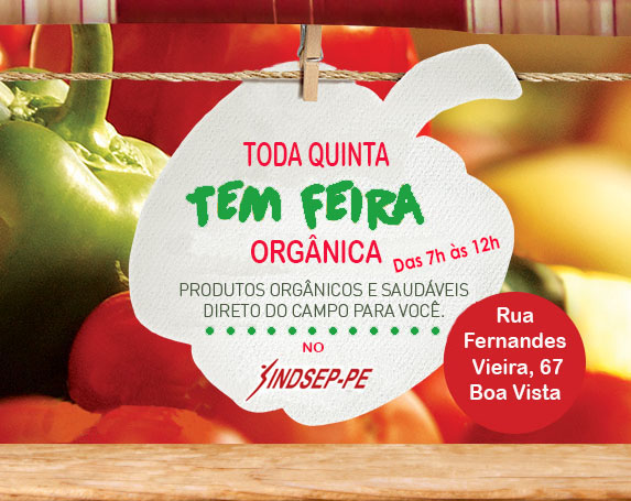 Nesta quinta-feira (30) também tem feira de produtos orgânicos na sede do Sindsep-PE. A feira acontece tradicionalmente toda quinta-feira, das 7h às 12h. Nela são oferecidas frutas, legumes, raízes e verduras. Banana, laranja, limão, beterraba, cenoura, alho-poró, coentro, macaxeira, batata doce, feijão verde e coco estão entre os produtos orgânicos comercializados.