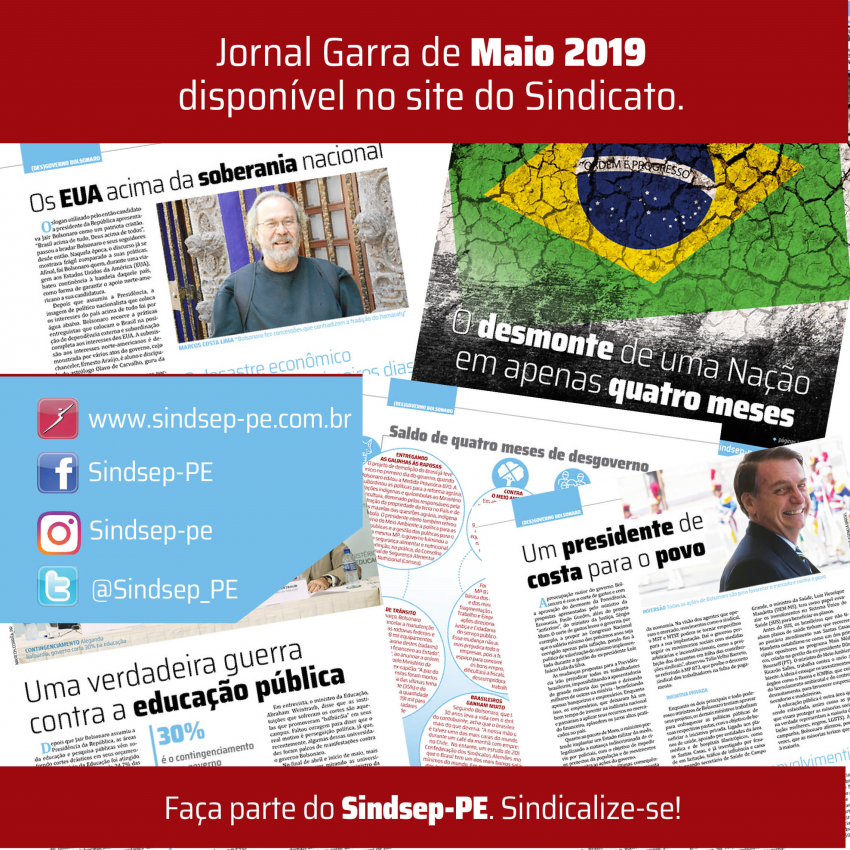 Os textos também abordam a linha ultraneoliberal da gestão Bolsonaro, um governo voltado para atender os interesses do mercado. Para acessar o Garra de maio, basta entrar no site do sindicato (www.sindsep-pe.com.br) e clicar no link do informativo que fica na parte superior e do lado direito da página.