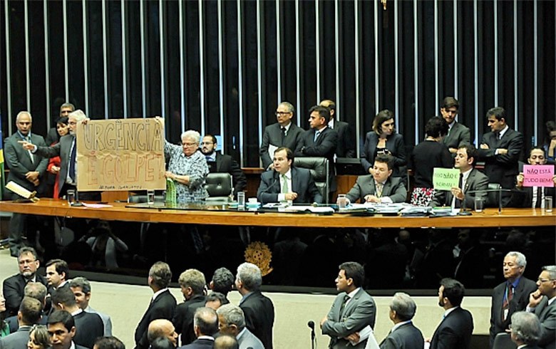 "Essa história de ser ao mesmo tempo presidente da Câmara e líder do governo não é algo que seja razoável", criticou o líder do Psol, Glauber Braga (RJ), referindo-se a Rodrigo Maia. O partido apresentou recurso para que a matéria não seja votada, afirmando ter o mínimo necessário de um terço dos deputados presentes, mas Maia ignorou o pedido e encaminhou a votação do requerimento de urgência. Parte dos parlamentares subiu até a mesa para pressioná-lo, gritando "golpe".
