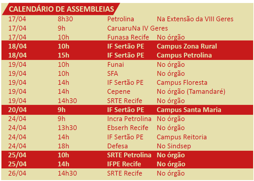 Na quarta, 19 de abril, tem cinco assembleias marcadas. Às 10h, na Funai Recife e na SFA; às 14h, no IF Sertão PE Floresta e Cepene Tamandaré. Às 14h30 é a vez da SRTE Recife. Para fechar a semana, na quinta, 20 de abril, no IF Sertão PE Santa Maria.