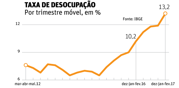 A população desocupada chegou a 13,5 milhões e bateu o recorde da série iniciada em 2012. Este contingente cresceu 11,7% (mais 1,4 milhão de pessoas) frente ao trimestre encerrado em novembro de 2016 e 30,6% (mais 3,2 milhões de pessoas em busca de trabalho) em relação a igual trimestre de 2016.