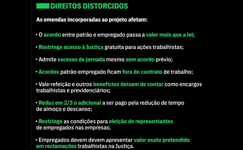 Embora todas as pesquisas de opinião apresentem a repulsa da população às reformas do governo ilegítimo, está prevista para esta terça, 11 de julho, a votação da reforma trabalhista no plenário do Senado. O projeto representa o fim da Consolidação das Leis Trabalhistas e fere de morte muitos dos direitos da classe trabalhadora (ver alguns pontos da reforma na imagem acima).