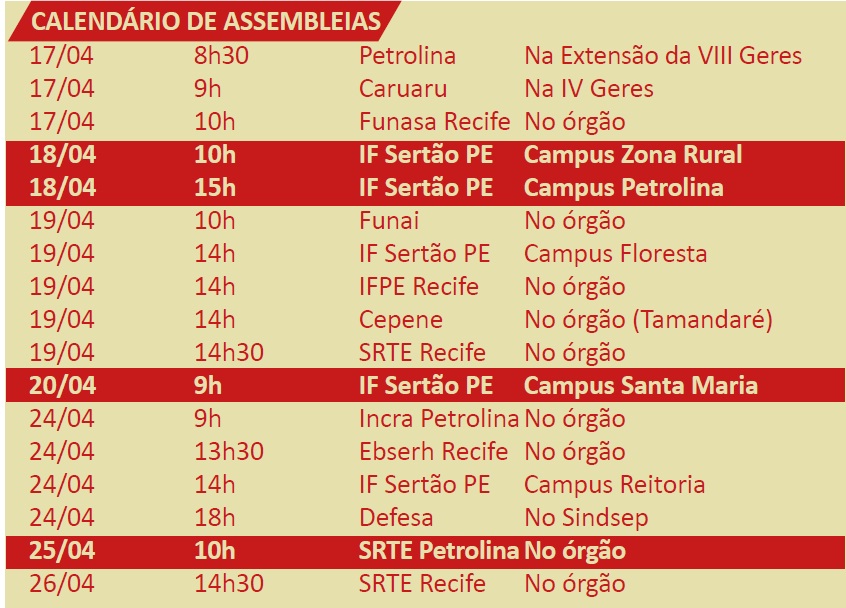 Na quarta, 19 de abril, tem cinco assembleias marcadas. Às 10h, na Funai Recife; às 14h, no IF Sertão PE Floresta, IFPE Recife e Cepene Tamandaré. Às 14h30 é a vez da SRTE Recife. Para fechar a semana, na quinta, 20 de abril, tem assembleia no IF Sertão PE Santa Maria.