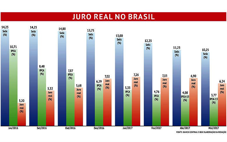 Apesar da redução de 1 ponto percentual na taxa básica de juros, com a decisão do Comitê de Política Monetária de fixar a Selic em 10,25% em reunião encerrada nessa quarta-feira (31), os juros reais seguem entre os mais altos do mundo, comprometendo a retomada da economia e prolongando os efeitos da crise. A taxa de juros real pode ser calculada dividindo a taxa de juros nominal (a Selic) pela inflação para o mesmo período. Com a prévia da inflação anualizada em 3,77% para maio – de acordo com o Índice Nacional de Preços ao Consumidor Amplo (IPCA-15), calculado pelo IBGE –, chega-se a uma taxa real de 6,24%.