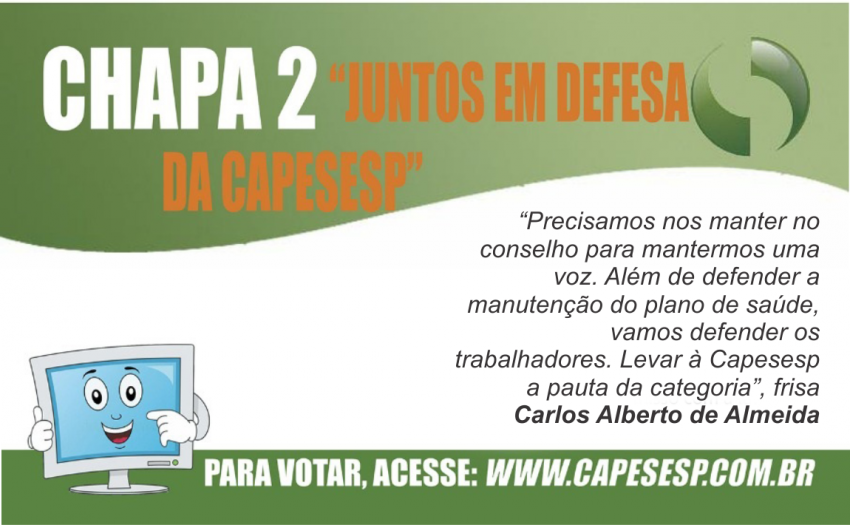 “Precisamos nos manter no conselho para mantermos uma voz dentre as cinco. Além de defender a manutenção do plano de saúde, vamos defender os trabalhadores. Levar à Capesesp a pauta da categoria”, frisa Carlos Alberto de Almeida, que concorre a vaga do Conselho Fiscal, enquanto Leonídia Laranjeira Fernandes, a do Conselho Deliberativo.