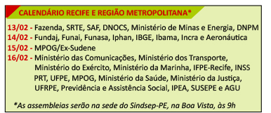 A primeira assembleia será na próxima segunda-feira, dia 13 de fevereiro, especificamente para os aposentados e pensionistas dos ministérios da Fazenda e de Minas e Energia, além da Superintendência Regional do Trabalho e Emprego (SRTE), da Secretaria Federal de Agricultura (SFA), do DNPM e do Dnocs. Na terça, dia 14, é a vez dos aposentados e pensionistas da Fundaj, Funai, Funasa, Iphabn, IBGE, Ibama, Incra e Aeronáutica elegerem seus representantes. Já na quarta, 15 de fevereiro, a assembleia será específica para MPOCG/ex-Sudene.