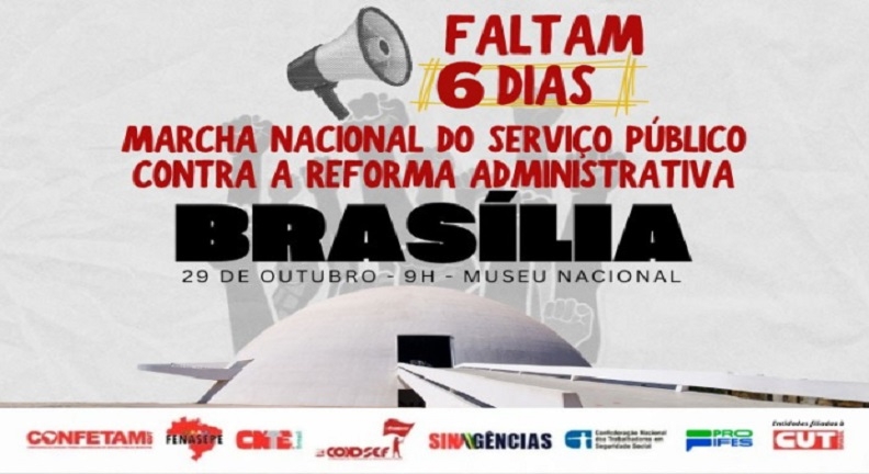 Servidores públicos de todo o país realizarão, no dia 29 de outubro (quarta-feira) a partir das 9h da manhã, no Museu Nacional da República, em Brasília, a Marcha Nacional do Serviço Público contra a Reforma Administrativa.