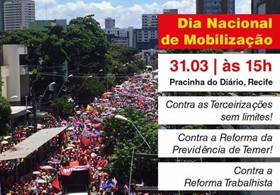 Nesta sexta, 31 de março, é Dia Nacional de Luta. Em Recife tem ato público a partir das 15h, na praçinha do Diario, no centro da cidade. O protesto é contra a reforma da Previdência, o PL da terceirização e todas as medidas recessivas e retirada de direitos da classe trabalhadora que estão sendo propostas pelo governo golpista de Michel Temer. A atividade é também uma preparação para a greve geral marcada para o dia 28 de abril. Participe por nenhum direito a menos!