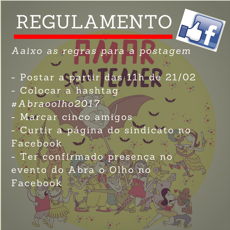 O Sindsep-PE realiza nesta terça-feira, 21 de fevereiro, às 11h, uma promoção no Facebook para o Abra o Olho. A partir deste horário, as quatro primeiras pessoas que postarem em suas timelines da rede social a hashtag #Abraoolho2017 (do jeito que está escrita) e marcarem cinco amigos vão ganhar um par de camisas do bloco de carnaval. Para concorrer também é preciso curtir a página do sindicato no Facebook e ter confirmado presença no evento criado na rede social.