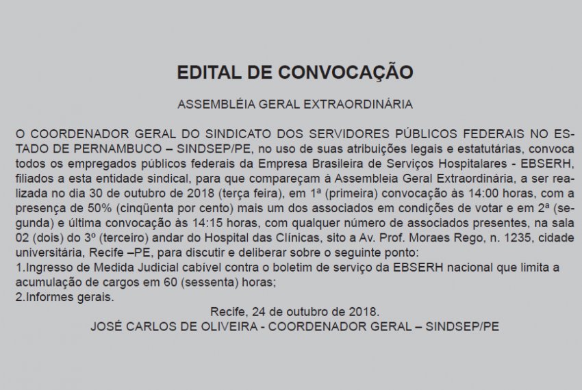 O Sindsep irá promover uma Assembleia Geral Extraordinária na próxima terça-feira (30/10) para os empregados públicos federais da Ebserh, filiados à entidade. O encontro acontecerá em 1ª convocação, às 14h, com a presença de 50% mais um dos associados em condições de votar e, em 2ª e última convocação, às 14h15, com qualquer número de associados presentes, na sala 02 do 3º andar do Hospital das Clínicas.