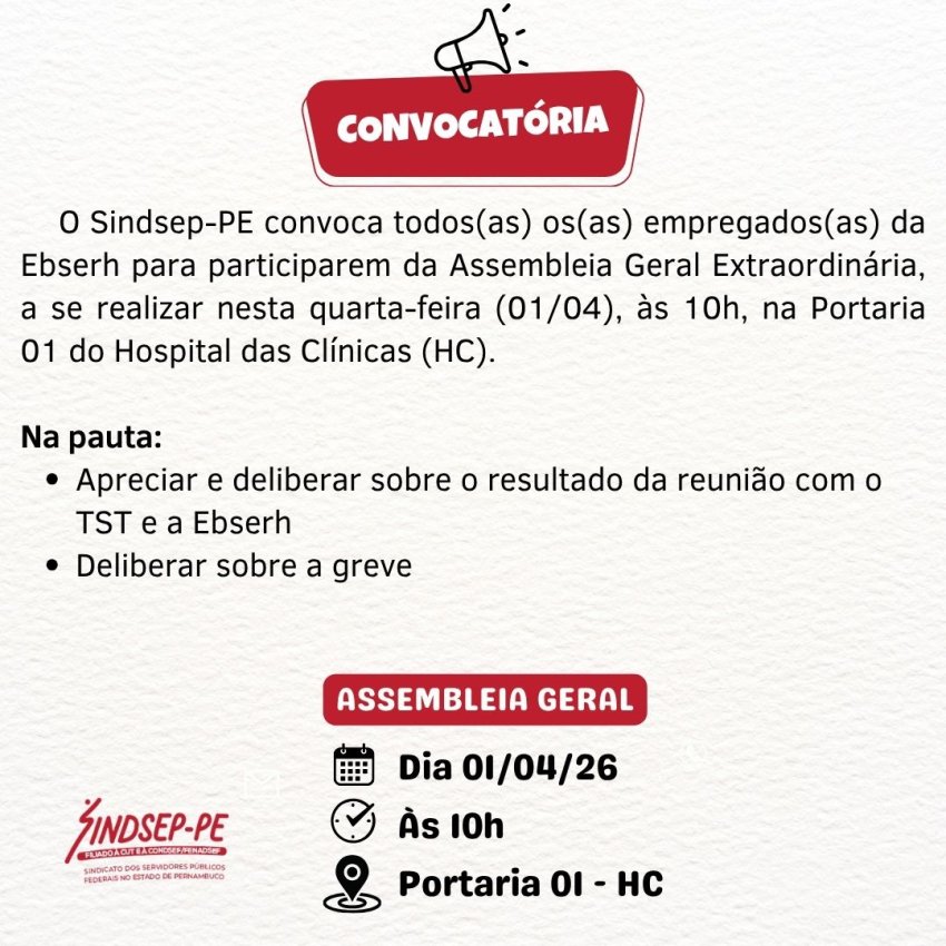 O Sindsep-PE convoca todas as trabalhadoras e trabalhadores da Empresa Brasileira de Serviços Hospitalares (Ebserh) para participarem da Assembleia Geral Extraordinária a se realizar nesta quarta-feira (01/04), às 10h, na Portaria 01 do Hospital das Clínicas (HC).