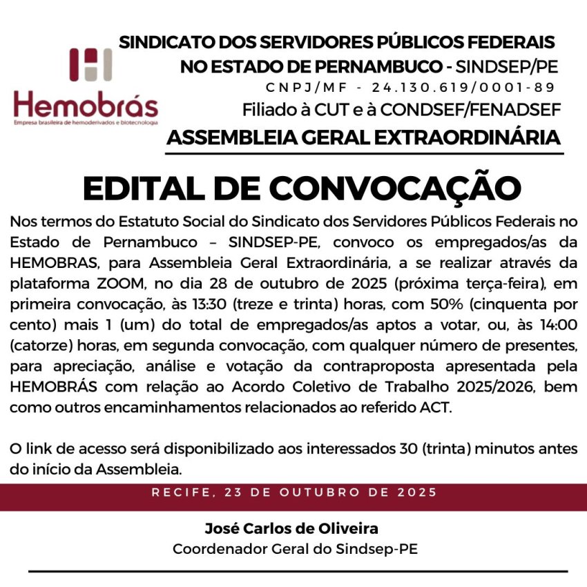 Na ocasião, será realizada a apreciação, análise e votação da contraproposta apresentada pela Hemobrás com relação ao Acordo Coletivo de Trabalho 2025/2026, bem como outros encaminhamentos relacionados ao referido ACT.