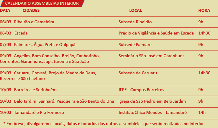 Em breve, divulgaremos locais, datas e horários das outras assembleias que serão realizadas no interior