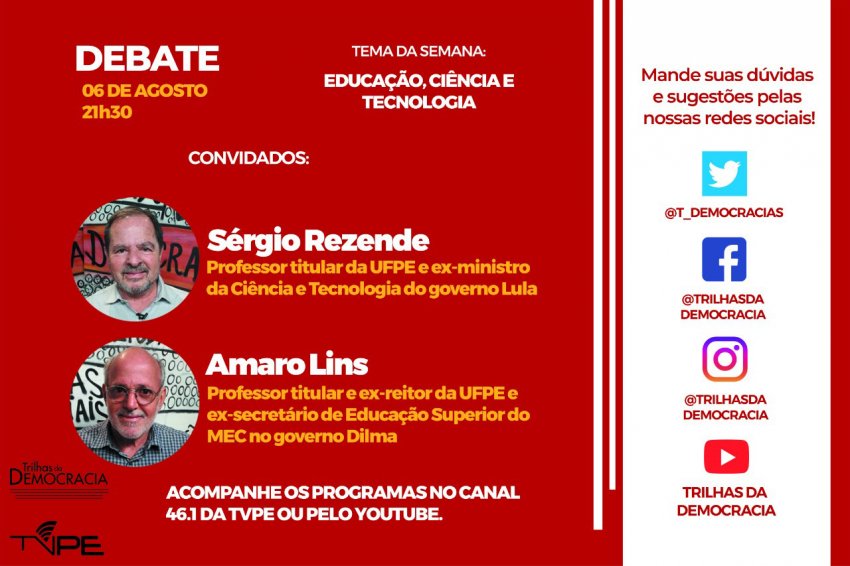 O programa Trilhas da Democracia desta terça-feira irá debater a situação da educação, ciência e tecnologia no Brasil atual. Para falar do assunto, o programa entrevista o professor da UFPE e ex-ministro de Ciência e Tecnologia do governo Lula, Sérgio Rezende, e o também professor titular e ex-reitor da UFPE, ex-secretário de Educação Superior do MEC no governo Dilma, Amaro Lins.